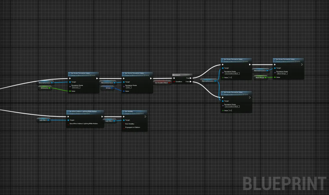 다이나믹 머티리얼 인스턴스를 활용하여 제작되어, 머티리얼을 직접 생성하지 않고 블루프린트의 파라미터를 통해 조절할 수 있습니다.