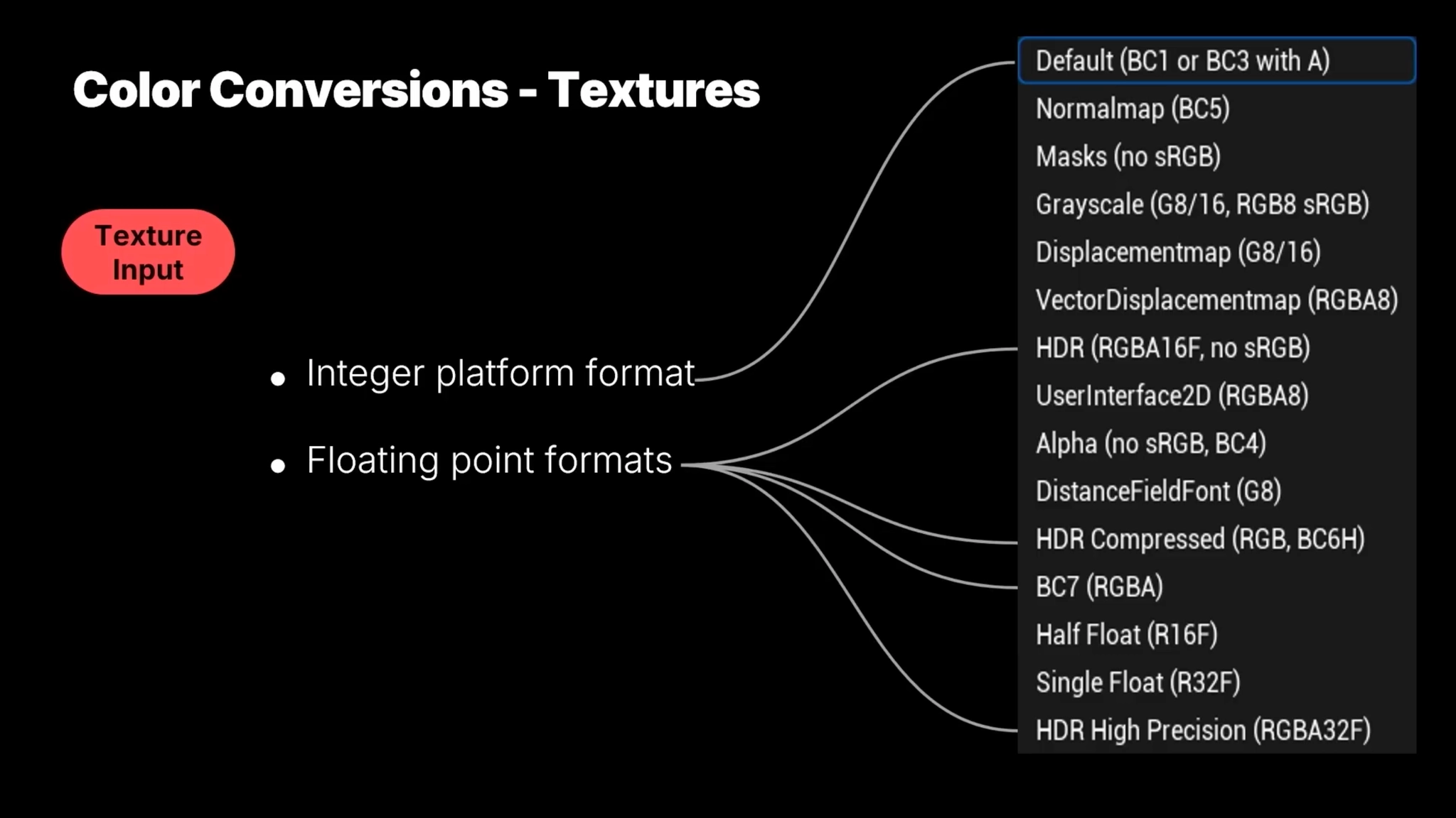 Float (부동 소수점) : HDR / HDR Compressed / BC7 / HDR High Precision