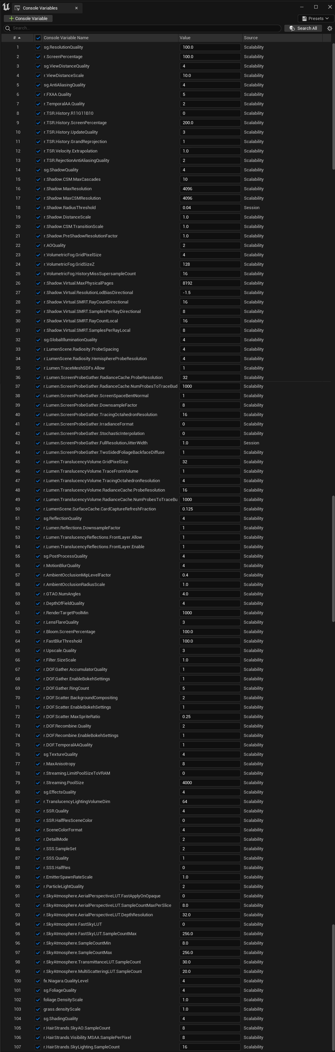 Game Override 기능으로 한번에 적용되는 옵션들은 아래의 콘솔 변수와 같습니다. (참고용) 아래 옵션들은 콘솔 변수에 중복으로 적용되지 않도록 하는 것이 좋습니다.